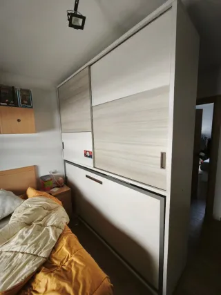 Mueble modular para habitación juvenil, con diseño moderno y funcional. - Acabado en blanco y tostado. - Puertas correderas. - Incluye cama abatible. - Armario adicional con estanterías y perchero