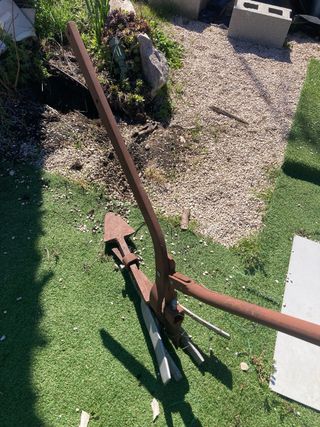 Herramienta antigua de arado, ideal como elemento decorativo para jardines o exteriores. - Material: Metal oxidado. - Diseño rústico.