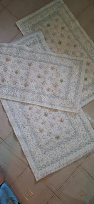 Conjunto de tres alfombras con un diseño delicado y moderno. Medidas: 2 uds. De 105x53 1 uds. De 126x64 - Tres alfombras incluidas en el set. - Diseño con motivos geométricos y detalles en tonos pastel. - Borde con acabado en color azul claro. LA ALFOMBRA MAS GRANDE TIENE 3 DESPERFECTOS EN EL TEJIDO, QUE PUEDEN SUBSANARSE.