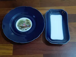 ¡Lote precioso de 2 piezas auténticas de porcelana francesa M & C & Co! Plato hondo/sopera con borde ondulado y medallón romántico: damas en bote con patos y cisnes (pintado a mano). Bandeja rectangular festoneada (ideal mantequilla, salsas o deco). Color azul cobalto intenso exterior, interior blanco. Marca base: "M & C & Co FRANCE" (siglo XIX-XX). Medidas aprox.: plato 23-25 cm diámetro, bandeja 20-22 cm largo. Buen estado vintage (Pequeña decoloración – visible en fotos). Perfecto colección porcelana francesa, mesa romántica, regalo vintage o deco shabby chic. ¡Ganga con historia! #porcelanafrancesa #mcofrance #azulcobalto #plato