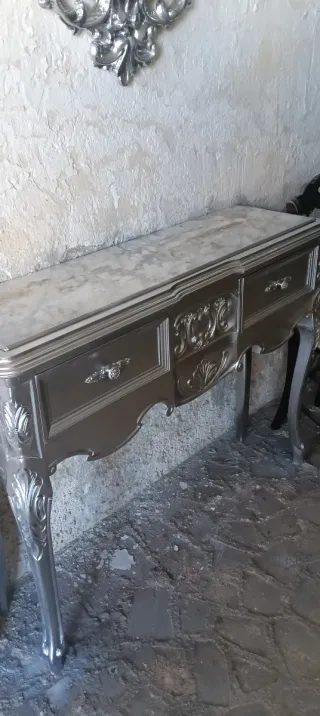 Elegante mesa de tocador con un acabado plateado y detalles ornamentales. - Diseño de estilo vintage. - Patas curvas con adornos. - Cajones con tiradores decorativos.