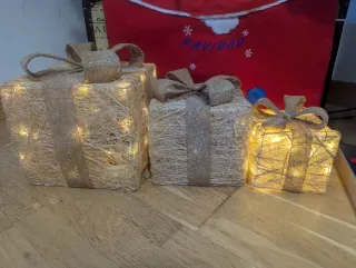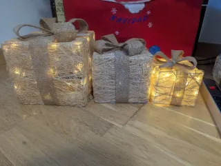 Conjunto de tres cajas decorativas con un diseño festivo, perfectas para ambientar tu hogar en Navidad. Cada caja está adornada con cintas y lazos brillantes, e iluminada con luces LED cálidas. - Diseño inspirado en regalos. - Iluminación LED integrada. - Acabado con detalles brillantes. - Baterías no incluidas.