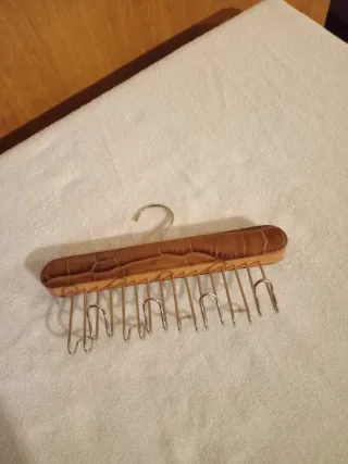 Organizador de corbatas con un diseño elegante. - Acabado superior en imitación piel. - Múltiples ganchos metálicos para colgar. - Diseño funcional para armarios.