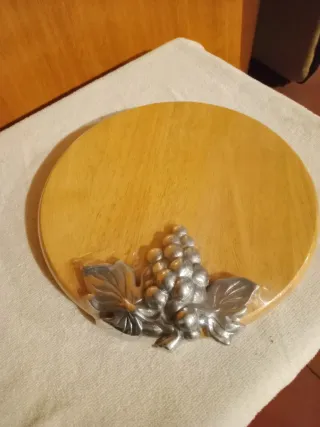 Bonita pieza decorativa redonda con un detalle de uvas. - Base de madera. - Aplique de metal con diseño de uvas y hojas.