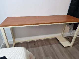 Mesa de escritorio con un diseño moderno y funcional. Combina una superficie de madera con una estructura metálica. - Tablero de madera con acabado en tono marrón. - Patas y estructura de metal en color beige. - Incorpora un práctico estante inferior.