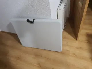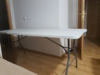 Mesa plegable de plástico y metal. - Superficie blanca. - Patas grises plegables.
