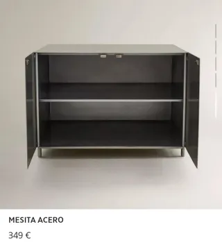 Mesita auxiliar de diseño moderno con acabado en acero. - Dos estantes interiores. - Puertas frontales con tiradores discretos. - Patas metálicas finas.