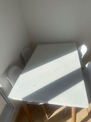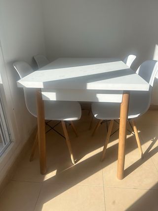 Mesa de comedor con un diseño moderno y elegante. Perfecta para compartir comidas. - Tablero de madera con acabado blanco. - Patas de madera para mayor estabilidad.