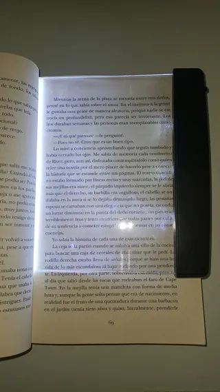 Linterna portátil para leer libros, ideal para iluminar tus páginas sin molestar. - Diseño compacto y ligero. - Se sujeta fácilmente al libro.