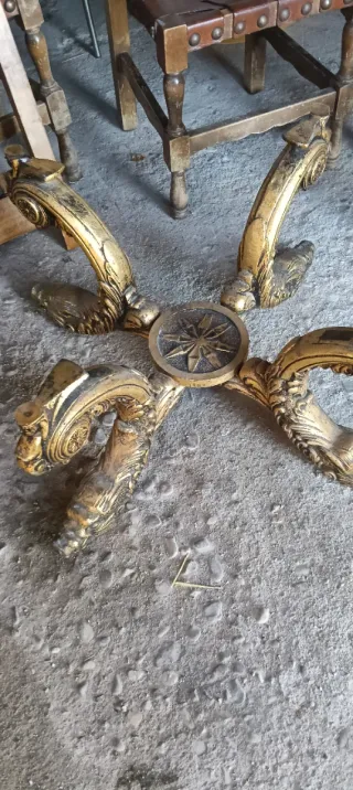 Base decorativa para mesa con un diseño intrincado y acabado dorado. - Patas con detalles ornamentales. - Pieza central con diseño de estrella. - Estructura robusta.tiene su cristal