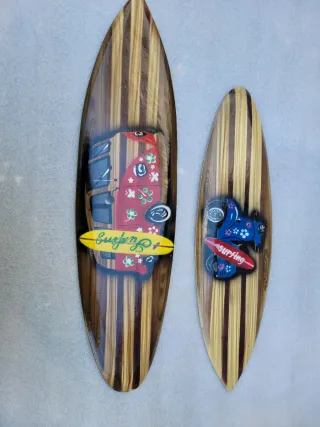 Dos tablas decorativas de madera con un diseño inspirado en el surf y la cultura playera. - Diseño de furgoneta y tabla de surf. - Acabado brillante. - Ideal para decoración temática.