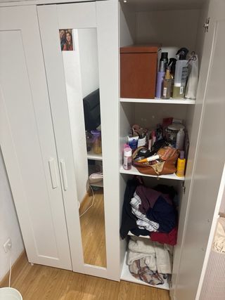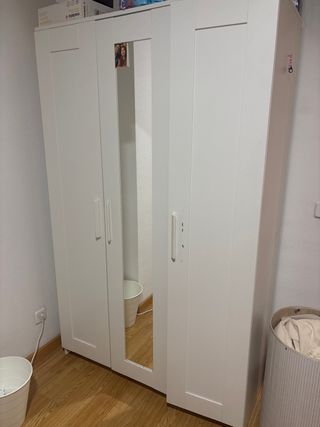 Armario de madera con puertas. - Diseño moderno y funcional. - Acabado en blanco. -Tiene arañazos y detalles pero está muy bien. Se vende por mudanza.
