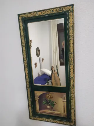 Elegante espejo con marco de madera pintada.altura 80 cm y ancho 36 cm.mejor verlo no hago envíos. - Marco decorado con motivos dorados y verdes. - Diseño vertical. - Parte inferior con una pintura decorativa de un jarrón con flores.