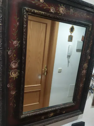 Elegante espejo con un marco de madera tallada y detalles dorados.altura 1'22 cm y ancho 30 cm.mejor verlo no hago envíos. - Marco con diseño floral. - Acabado en madera y dorado.