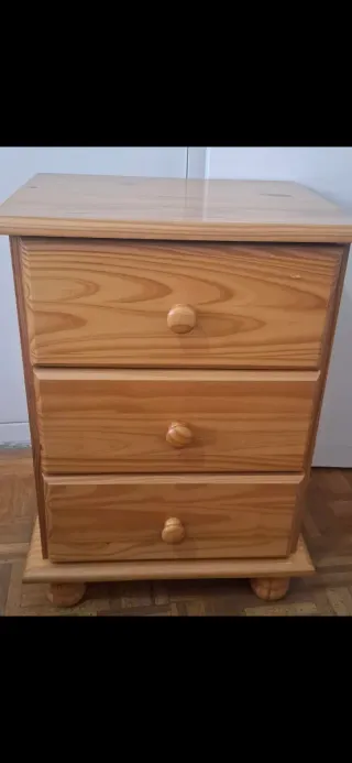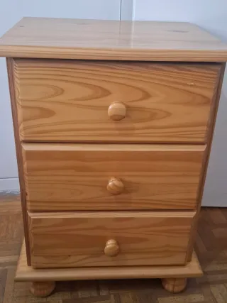 Mesita de noche de madera con tres cajones. - Diseño clásico y funcional. - Tiradores redondos. - Patas robustas.