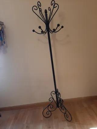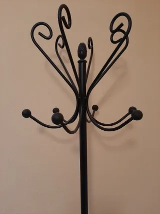 Elegante perchero de pie con un diseño clásico y funcional. Ideal para organizar abrigos, bolsos o sombreros. - Base con adornos curvos. - Múltiples ganchos en la parte superior.