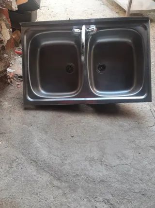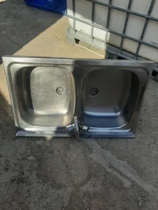 Fregadero de acero inoxidable con dos cubetas y grifo. - Diseño moderno y funcional. - Acabado plateado brillante. - Dos senos para mayor comodidad.