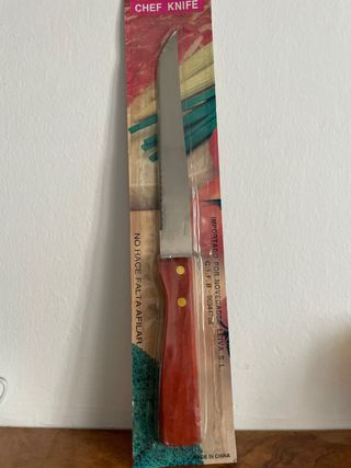 Cuchillo de chef con mango de madera y hoja dentada. - Hoja de metal. - Mango de madera. - Importado por Novedades Leiva S.L. - Fabricado en China.