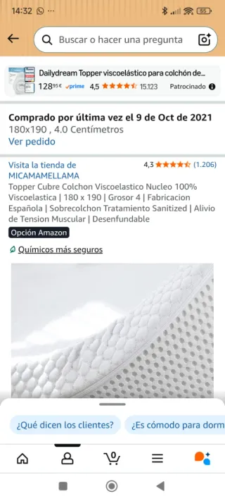 Topper viscoelástico de la marca Dailydream, ideal para colchones. - Medidas: 180 x 190 cm. - Grosor: 4 cm. - Fabricación española. - Tratamiento Sanitized. - Desenfundable.
