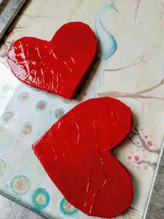 Conjunto de dos posavasos hechos a mano con forma de corazón. - Color rojo brillante. - Diseño único y artesanal.