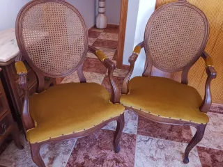 Elegante juego de dos sillas grandes mas una pequeña con un diseño clásico y detalles cuidados. - Estructura de madera robusta. - Asientos tapizados en terciopelo. - Respaldo con acabado en ratán. - Patas de madera tallada.