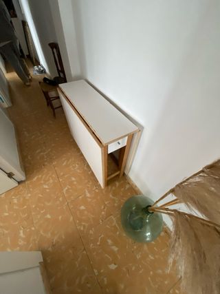 Mesa de madera con acabado blanco, ideal para espacios reducidos. - Diseño plegable para fácil almacenamiento. - Estructura de madera robusta. 85x30x73cm cerrado 85x145x73cm abierto Recojida Oliva Playa 3e planta.