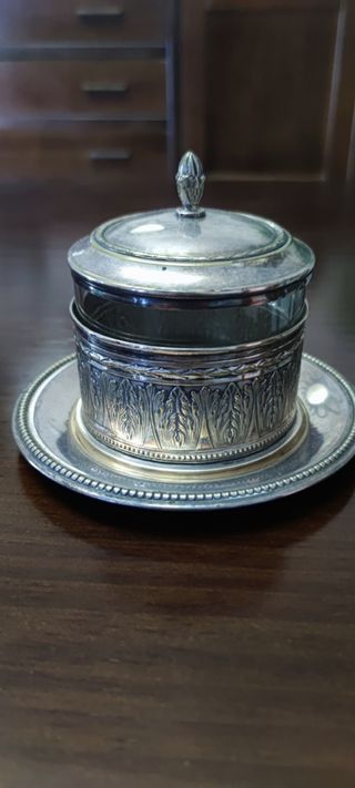 Elegante bombonera con detalles en metal plateado labrado y cuerpo de cristal. - Diseño decorativo. - Base a juego, platillo. Medidas: altura 10cm, diámetro del recipiente: 9 cm.