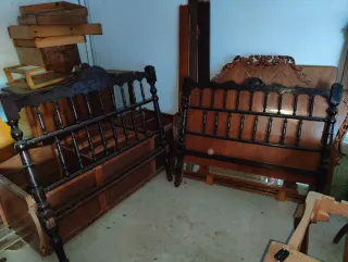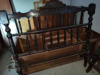 Estructura de cama matrimonio antigua con un diseño clásico y elegante. - Fabricada en madera. - Detalles tallados en el cabecero y piecero -Se vende con toda la estructura