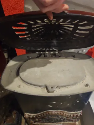 Estufa de cerámica con un diseño rústico y detalles en metal. Aporta un toque clásico a cualquier espacio. - Acabado en tonos marrones y negros. - Diseño ornamental en la puerta.