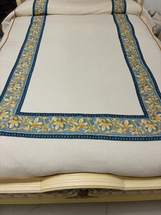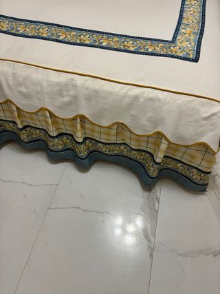 Conjunto de colcha, edredón y dos cojines. - Diseño floral y a cuadros. - Ribete decorativo.
