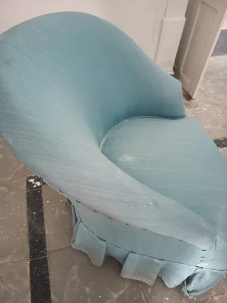 Elegante butaca antigua tapizada en tela. Su diseño clásico y su color la convierten en una pieza única para cualquier espacio. - Tapicería de tela. - Diseño clásico y envolvente. - Falda plisada en la base.