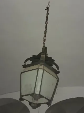 Elegante lámpara colgante de estilo antiguo. Su diseño combina metal y cristal para un toque clásico. - Estructura metálica. - Paneles de cristal.