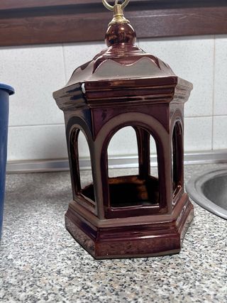 Elegante lámpara de estilo marroquí, con un diseño intrincado y detalles cuidados. Color bronce y marron. - Fabricada en cerámica de alta calidad. - Acabados en bronce brillante. - Medidas: Alto 33cm ancho 11cm. Forma exagonal.