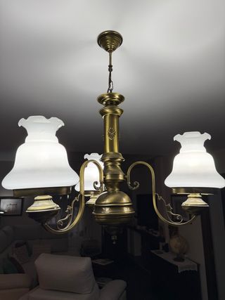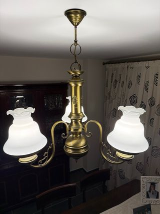 Vendo 2 lámparas de techo iguales, de estilo clásico/rústico. Estructura de metal con detalles decorativos y tulipas de cristal color ámbar. Ideales para salón, comedor o casa rural. Se venden juntas (pack de 2). En buen estado, proceden de desmontaje. Entrega en mano o envío a cargo del comprador.