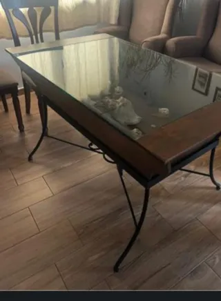 Mesa de escritorio con tablero de cristal y estructura de madera. - Diseño moderno y minimalista. - Patas de madera robustas. Son dos caballetes de madera con altura regulable con un estante inferior de madera. Una de las palometas está rota, no afecta a su función.