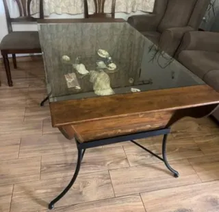 Mesa hecha con artesa antigua de matanza y cristal de grosor 1'5 cm y patas de forja
