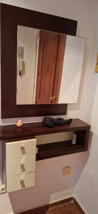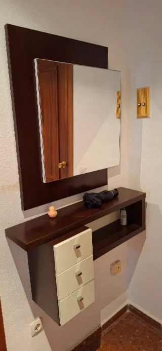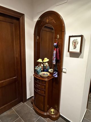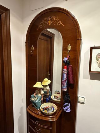 Conjunto de mueble recibidor con espejo, perfecto para dar un toque elegante a tu entrada. - Mueble de madera con detalles decorativos. - Espejo con marco de madera. - Diseño clásico y funcional.