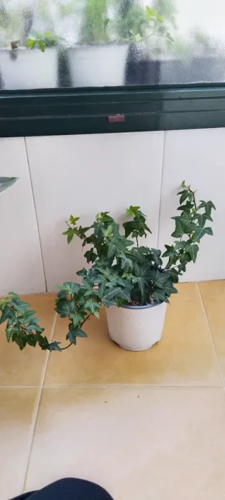 Planta de hiedra en maceta blanca. Ideal para interiores o exteriores. - Hojas verdes con forma característica.