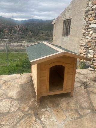 Caseta de madera para perros, con techo a dos aguas. - Material: Madera. - Techo: Color verde. Tamaño grande. Aislamiento térmico. Solo un mes de uso