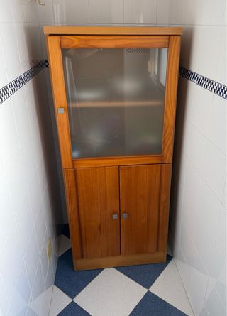 Muebles de madera con un diseño funcional. Se venden juntos los 3 o separados. - Parte superior con vitrina de cristal. - Parte inferior con dos puertas de madera. - Tiradores metálicos. Hay más muebles en venta en mi perfil, están en un tercero con amplias escaleras, si interesan habría que ir por ellos. Si se está interesado en varios el precio sería negociable.