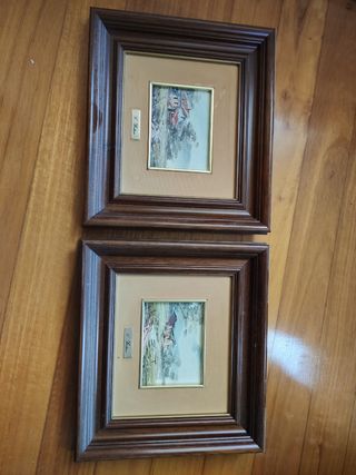 Dos cuadros imitación de cobre el fondo es de terciopelo y siempre se le puede cambiar, las medidas son 45X45, la verdad es que las fotos no les hacen justicia son mucho más bonitos en persona,el labrado es rustico, quedarían muy bien en cualquier pared. Más cositas en mi perfil
