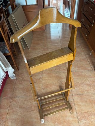 Elegante perchero de pie con un diseño clásico. - Fabricado en madera. - Acabado en tono marrón cálido. - Ideal para organizar ropa.