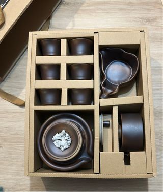 Precioso juego de té chino tradicional de cerámica oscura (estilo Yixing), ideal para amantes del té, coleccionistas o para decoración. El set incluye: • 1 tetera con tapa • 1 cuenco grande (cha hai / cuenco de servicio) • 1 jarrita • 6 tazas pequeñas • Caja original con separadores Color marrón oscuro, acabado mate, diseño elegante y minimalista. Piezas robustas y bien conservadas, sin golpes ni grietas (ver fotos). Completamente nuevo Perfecto para ritual del té (gong fu cha) o como regalo especial. #te #juegodete #techino #yixing #ceramica #decoracion #hogar #regalo #oriental
