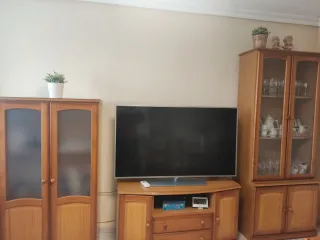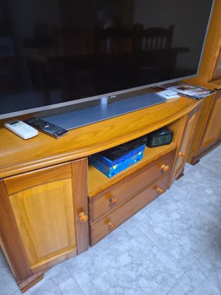 Conjunto de comedor en madera de color miel. 3 módulos. Nuevo sin apenas uso y los muebles son de madera maciza y se conservan como el primer día. Ubicación Onil (Alicante) - Módulo televisor: 1,20cm largo x 42cm de ancho -vitrina baja: 85cm x 1,45cm - vitrina alta: 2 metros x 80 cm También esta la mesa con las 4 sillas que puede venderse junto o separado.