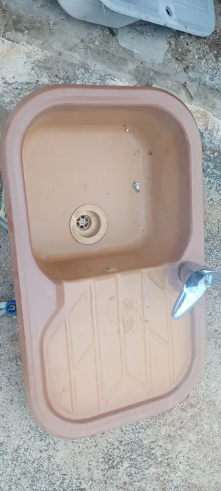 Fregadero de resina en color marrón con un seno y escurridor integrado. Su diseño es moderno y funcional. - Material: Resina. - Color: Marrón. - Configuración: 1 seno y escurridor.med 84 ctmos de largo, 51 dmctmos de ancho, con grifo y latiguillos, tal como se ve en las fotos 643023147