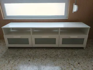 Mueble de TV de diseño moderno y funcional. - Acabado en color blanco. - Tres compartimentos abiertos superiores. - Tres cajones con frente de cristal. - Tiradores integrados en los cajones. - El mueble está montado ahora, pero se puede desmontar si es necesario. - Sus medidas son: 180 cm de largo, 41 cm de ancho y 53 cm de alto, ideal para una televisión grande y para guardar cosas en el salón. - Precio del nuevo en IKEA es 129 €. - Tiene pequeños defectos (una mancha y rayones leves) como se ve en las fotos adjuntas.