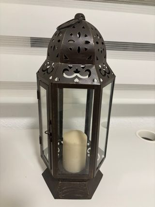 Elegante portavelas con un diseño intrincado. - Estructura de metal con detalles calados. - Paneles de cristal transparente. - Base octogonal. - Incluye una vela. -Medidas: 37 x 15 cm