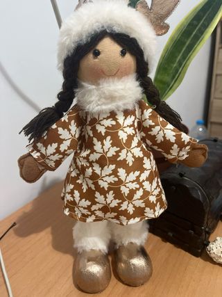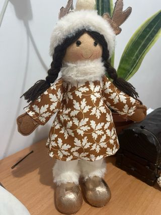 Encantadora muñeca decorativa con temática invernal. - Vestido con estampado de hojas. - Gorro y bufanda de pelo sintético. - Botas doradas brillantes. - Detalles de astas en el gorro.