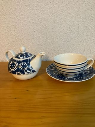 Conjunto de tetera y taza con plato. - Diseño con motivos circulares en azul y blanco. - Detalles de rayas en la taza .