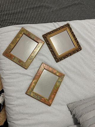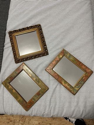 Conjunto de tres espejos decorativos con un estilo vintage. - Marco con diseño floral y acabado multicolor. Dos unidades. Medidas: 19 x 24 cm - Marco con detalles ornamentales dorados. Medidas: 24 x 24 cm Tienen alguna marca de uso, pero pequeña, que de lejos no se aprecia. Yo los usaba de cabecero...